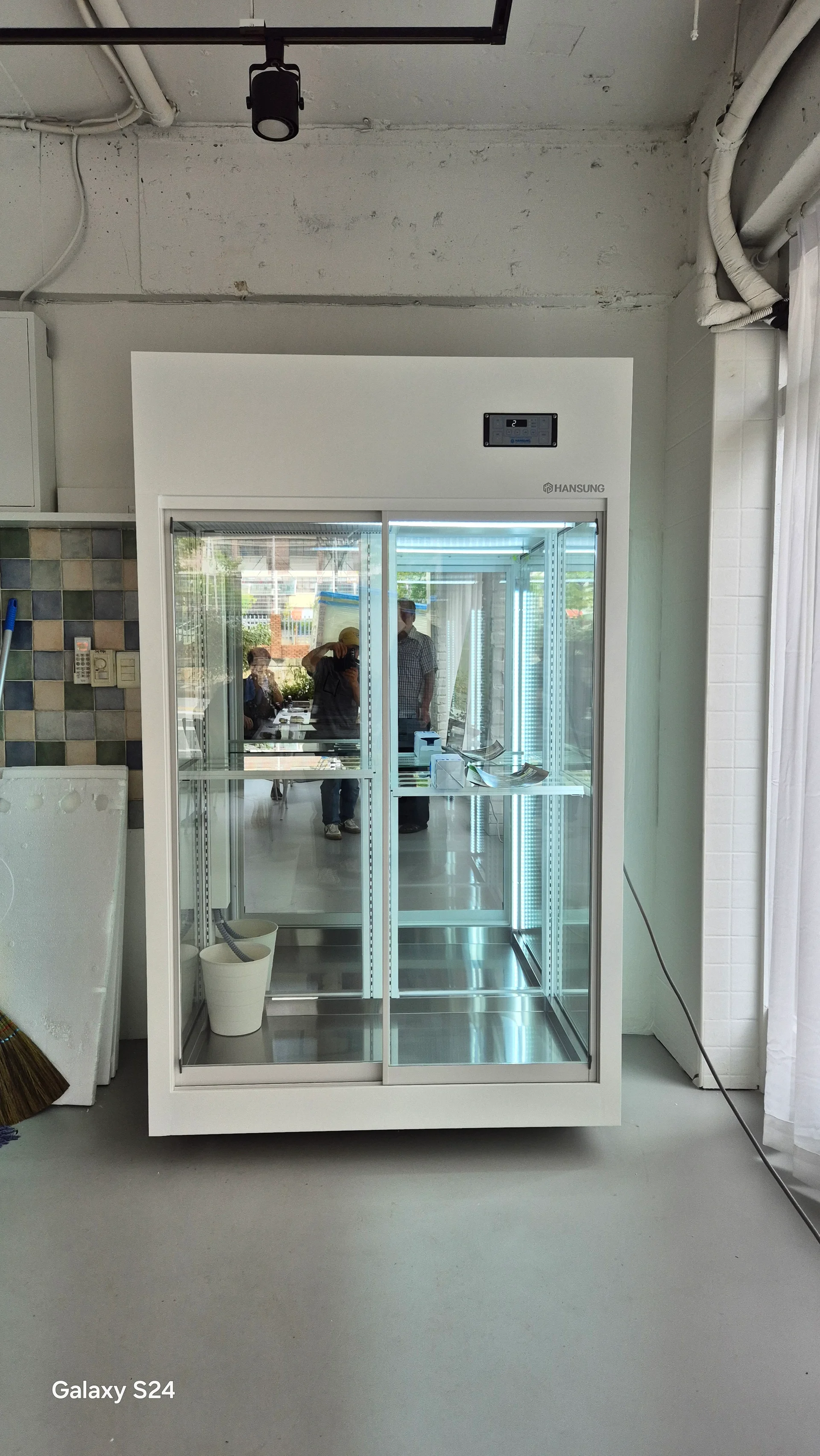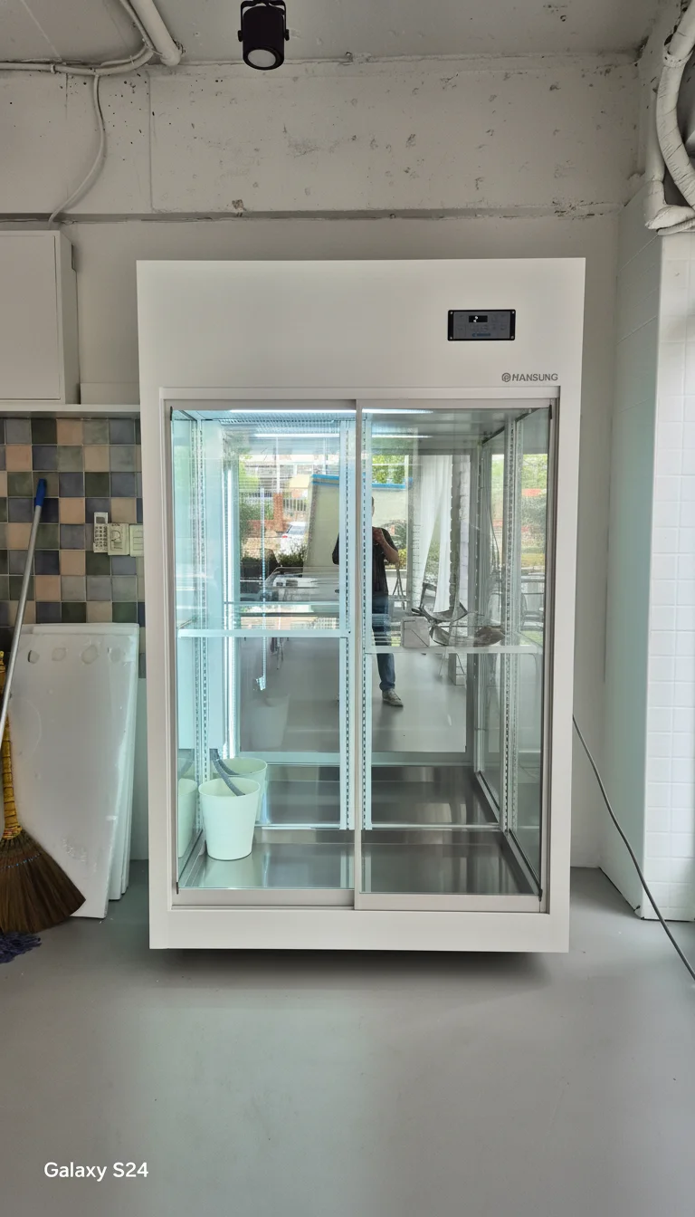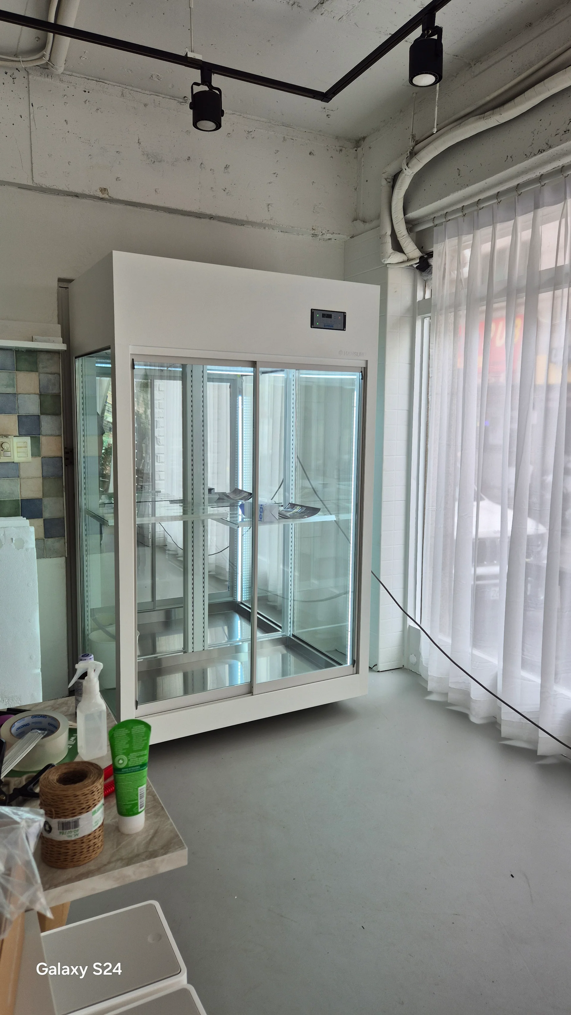 사진에서 보시는 것처럼 이 플라워쇼케이스는 깔끔하고 모던한 디자인으로 어느 공간에 배치해도 세련된 분위기를 연출합니다. 투명한 유리 도어를 통해 내부가 한눈에 보여 고객님들이 원하시는 꽃을 쉽게 찾으실 수 있으며, 상부의 디지털 온도 조절 패널로 정확한 온도 관리가 가능합니다.