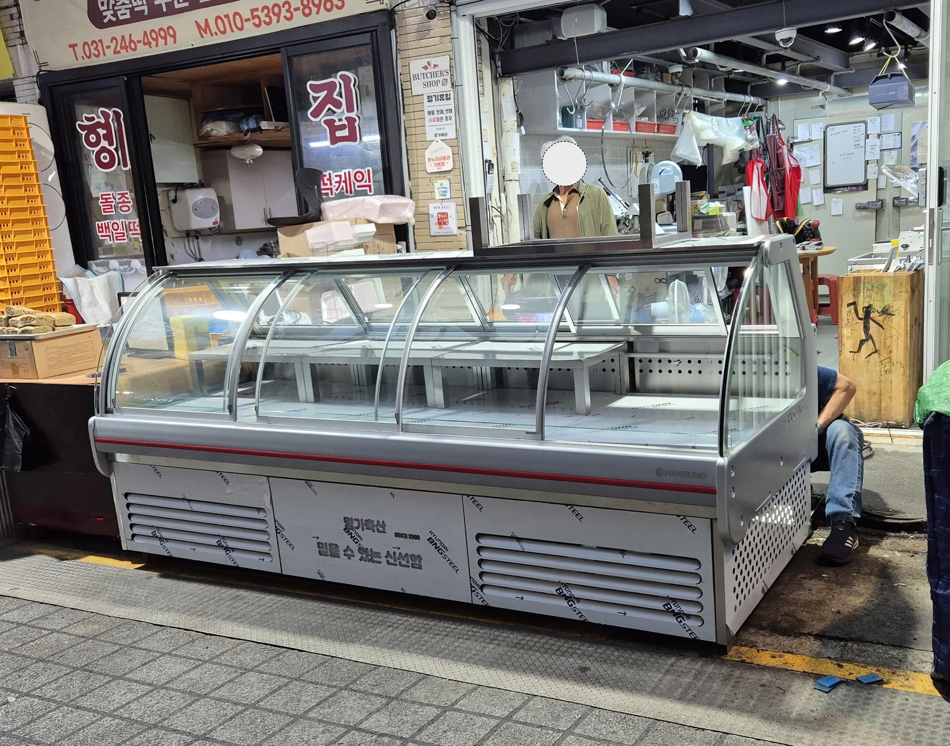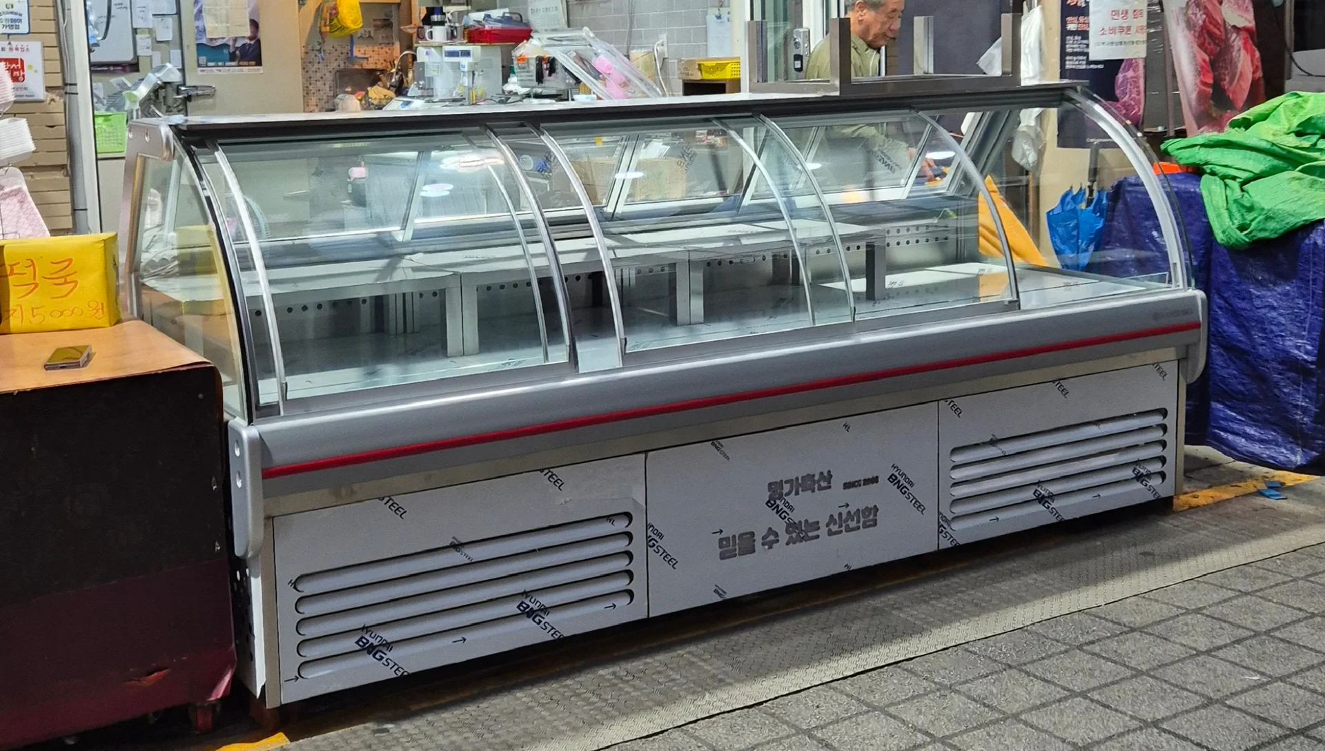 일반 사각형 냉장고와 달리 유리가 곡선으로 되어 있어 고객이 다양한 각도에서 고기를 볼 수 있습니다.