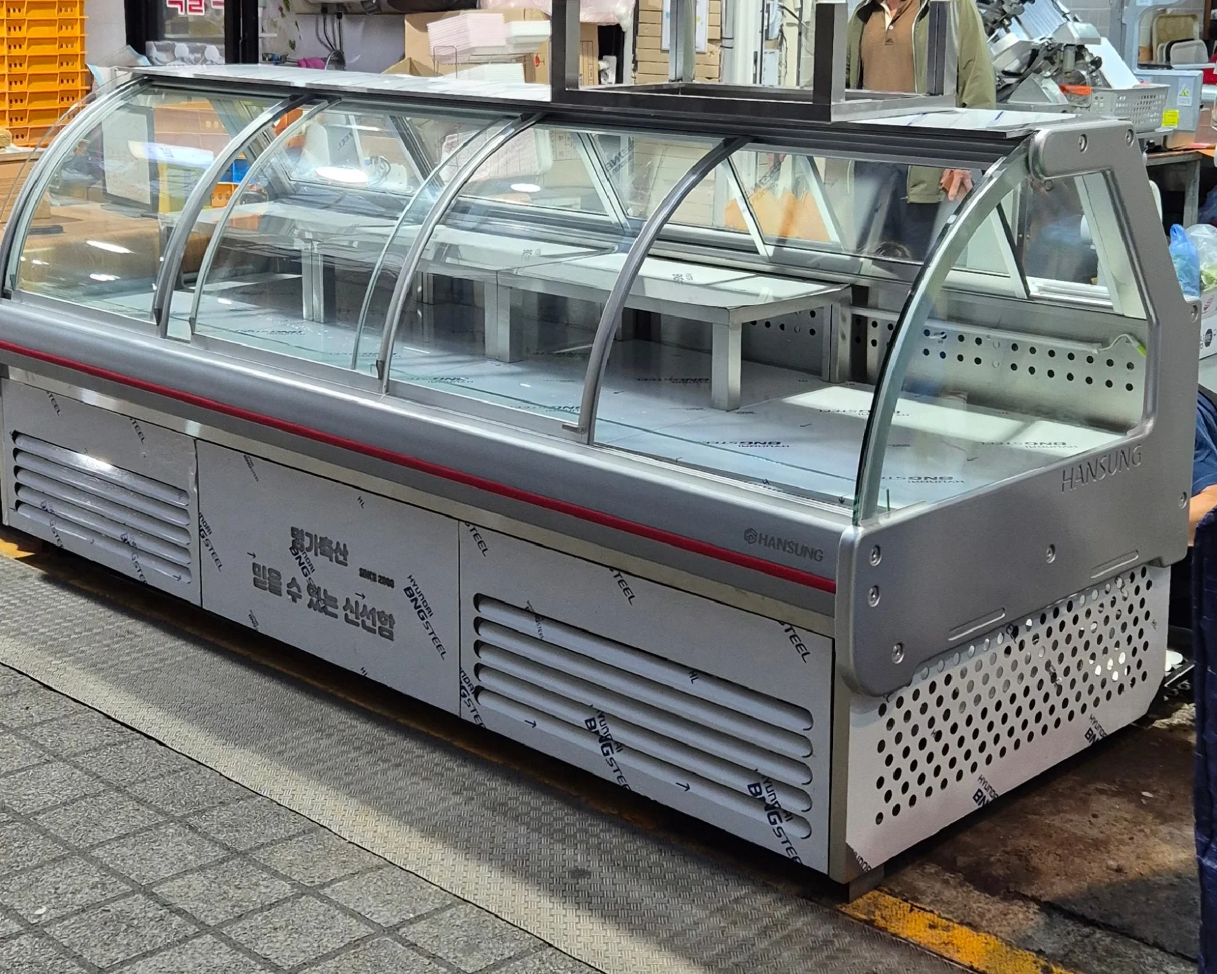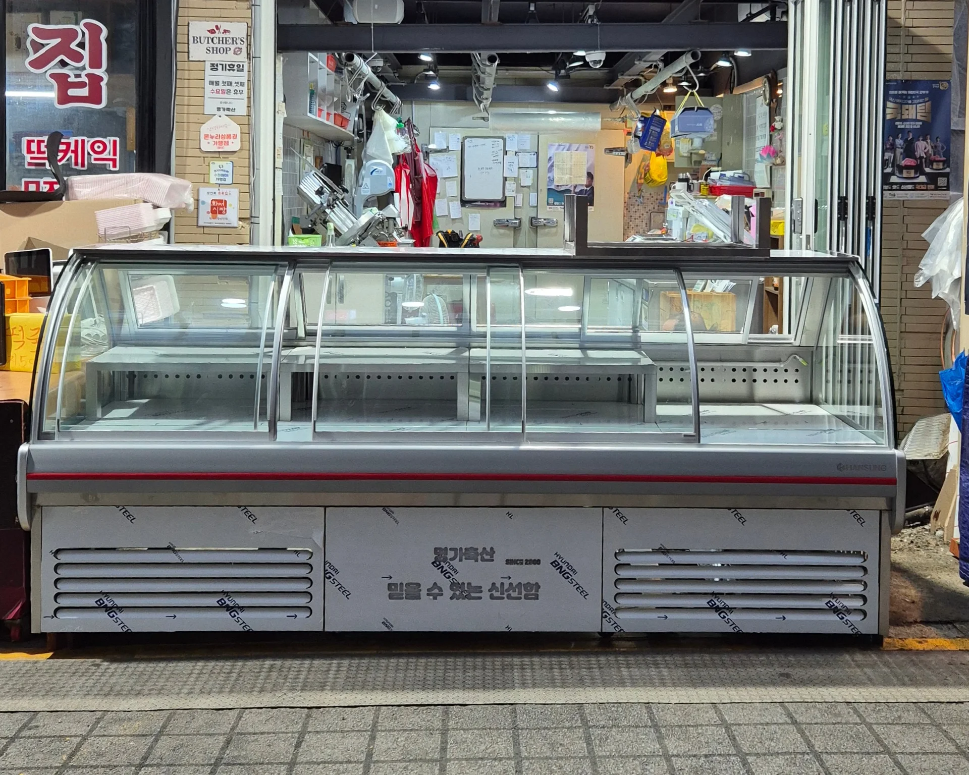 유럽형 정육 냉장고는 곡면 유리가 특징인 대형 쇼케이스입니다.