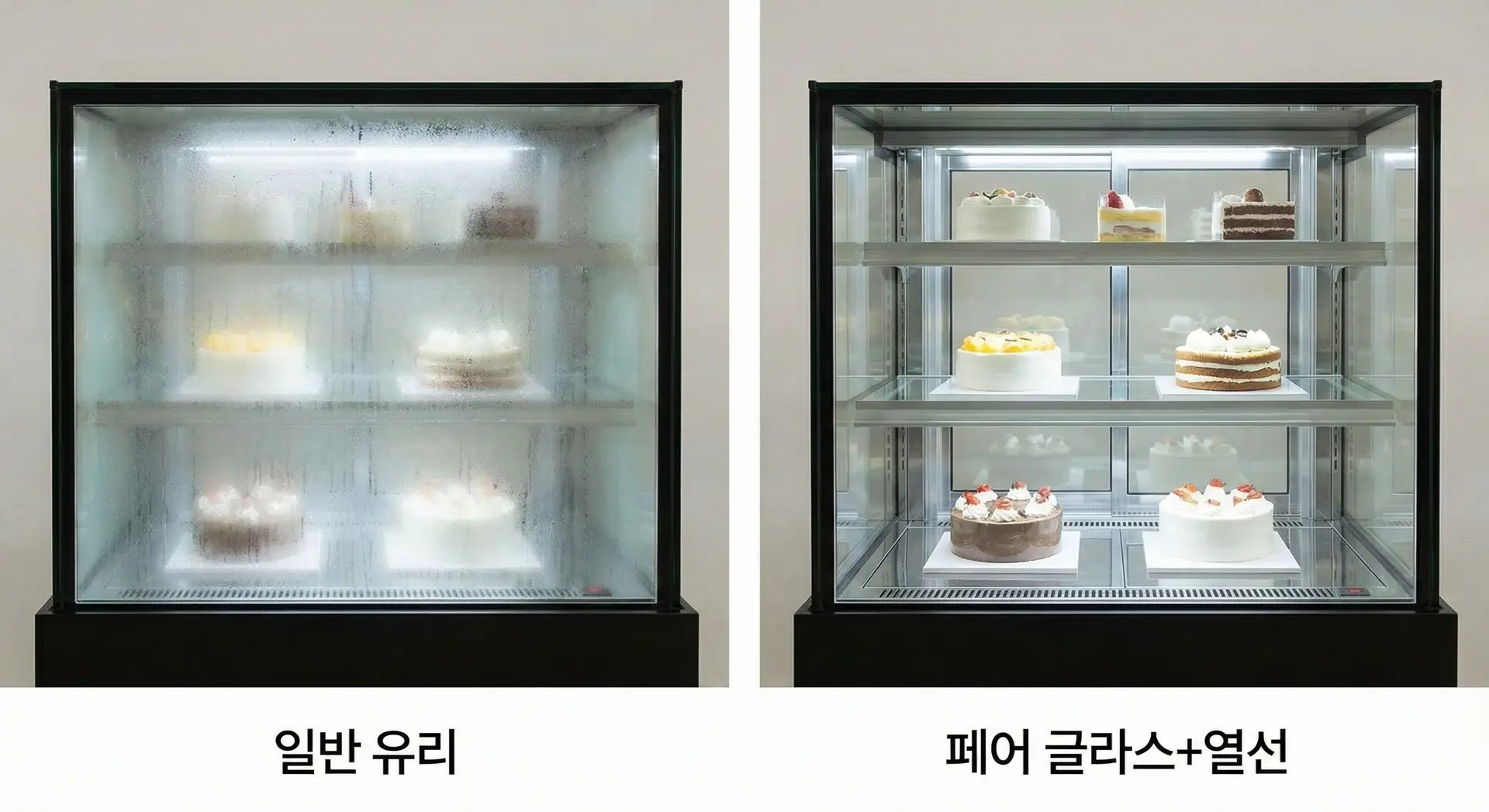 열선 처리 (Hot Wire): 이게 정말 중요해요. 유리에 미세한 열선을 깔아서 표면 온도를 살짝 높여주는 기능이에요. 이렇게 하면 습한 장마철에도 뽀송뽀송하고 투명한 유리를 유지할 수 있어서 손님들이 디저트를 훨씬 선명하게 볼 수 있답니다.