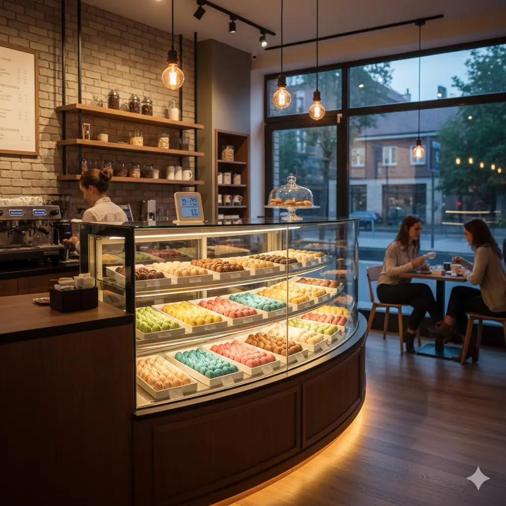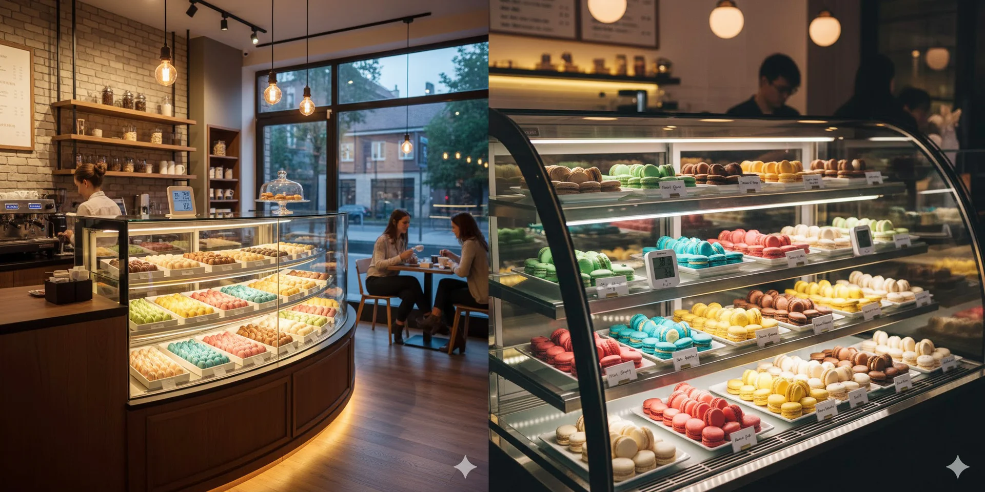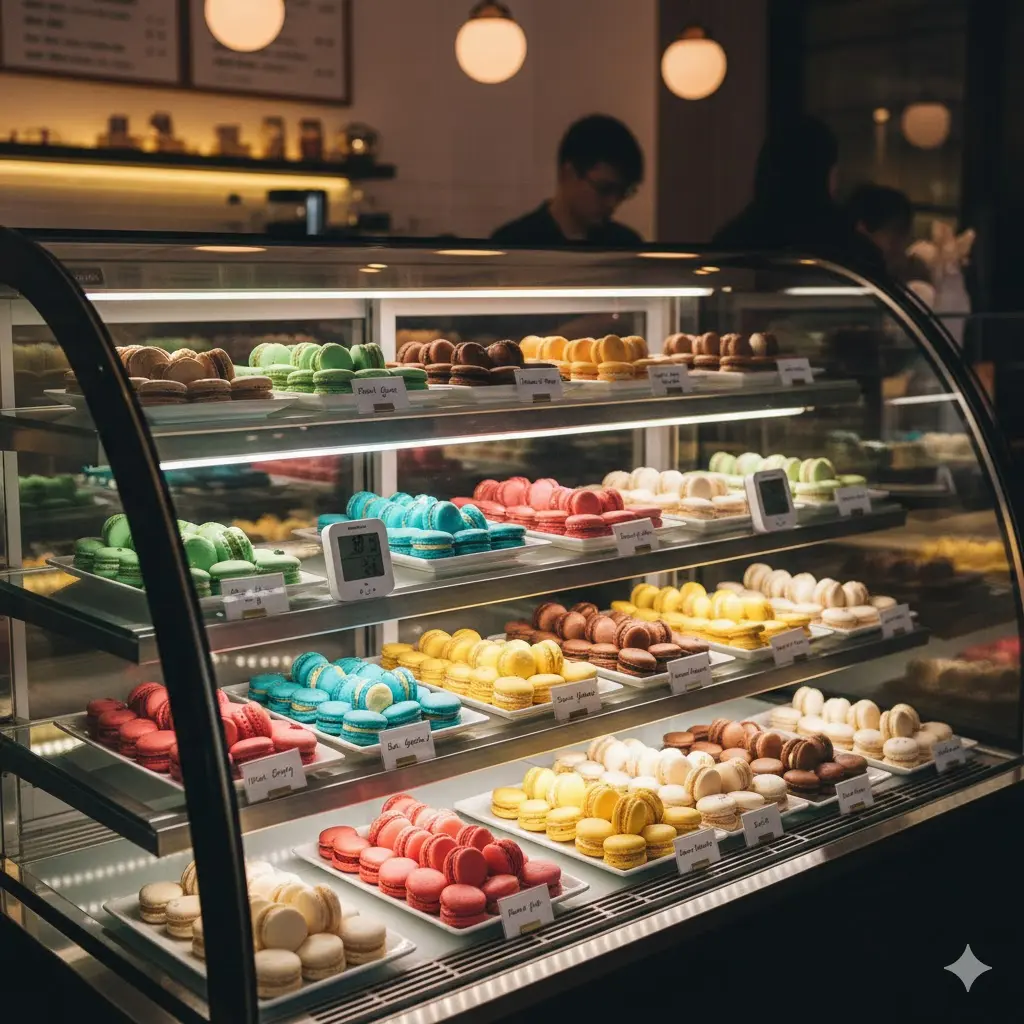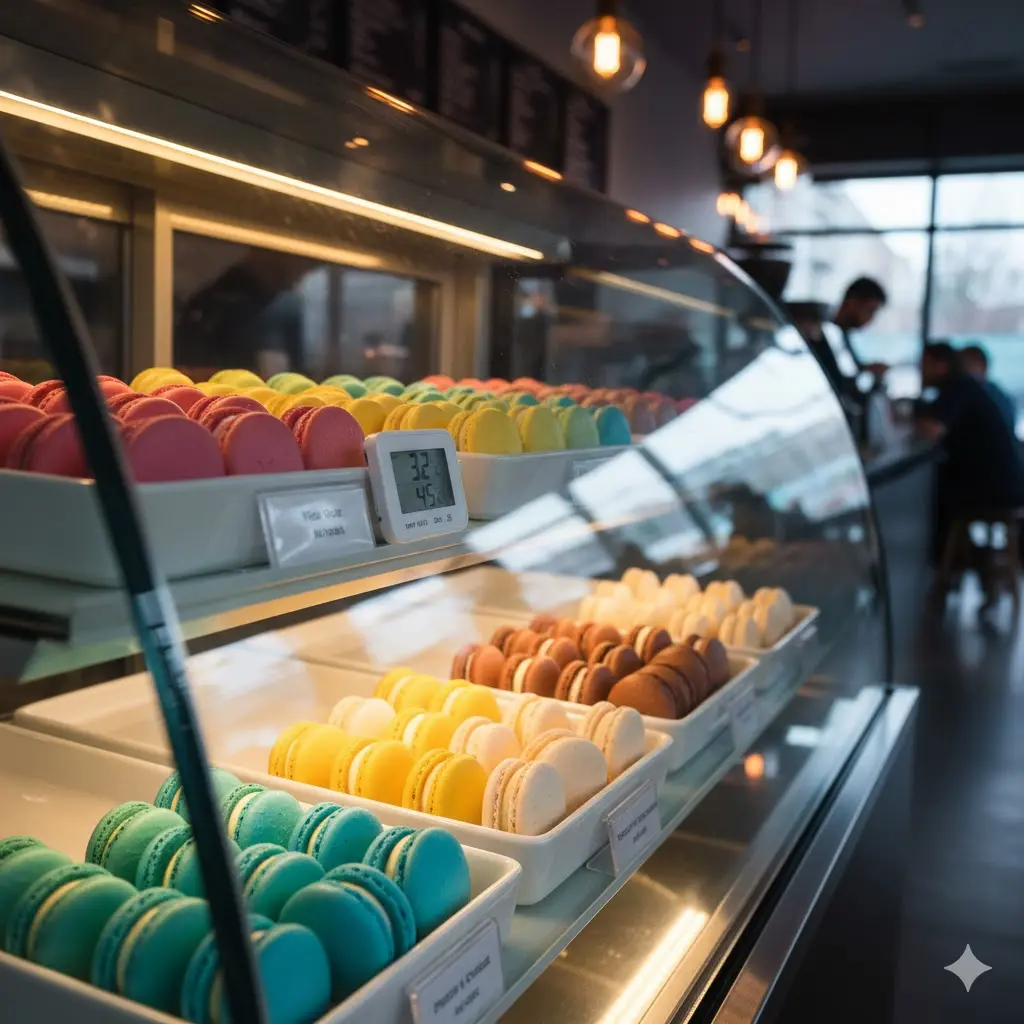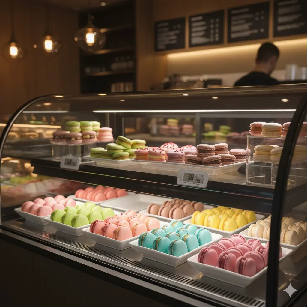 마카롱 쇼케이스 관리는 단순히 낮은 온도를 유지하는 것을 넘어, 정확한 온도 2°C~5°C와 낮은 습도 40%~50%를 일정하게 유지하는 정교하고 과학적인 운영이 필요합니다.