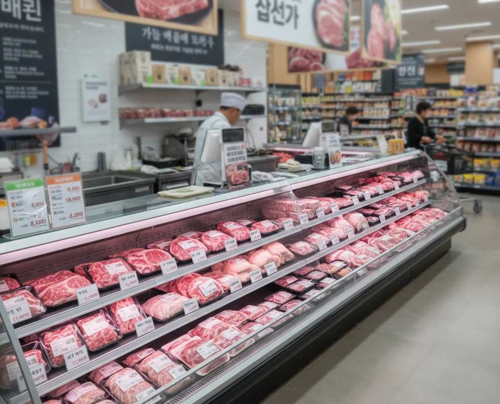 육류 쇼케이스는 일반 냉장고와 달리 고기의 붉은색을 강조하는 특수 조명(Meat Lighting)을 사용해야 합니다.