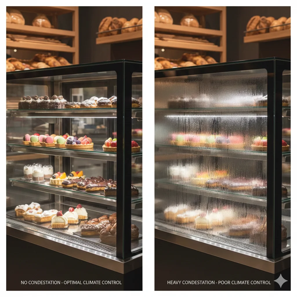 매장 습도 관리: 매장 내부에 제습기나 에어컨을 가동하여 습도를 낮추는 것이 가장 중요합니다. 쇼케이스 주변 환경이 건조할수록 결로가 현저히 줄어듭니다.