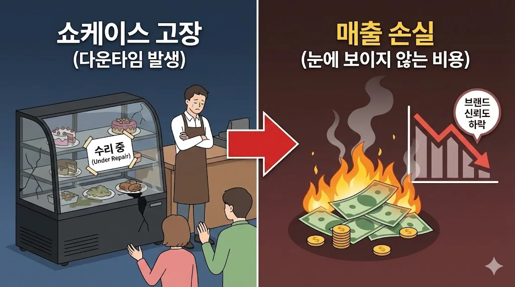 쇼케이스가 멈추면 당장 진열된 식재료를 폐기해야 하는 '재고 손실'이 발생합니다. 하지만 더 큰 문제는 장사를 못 해서 날리는 '매출 손실'과, 발길을 돌린 손님들이 느끼는 '브랜드 신뢰도 하락'이라는 보이지 않는 손해입니다.