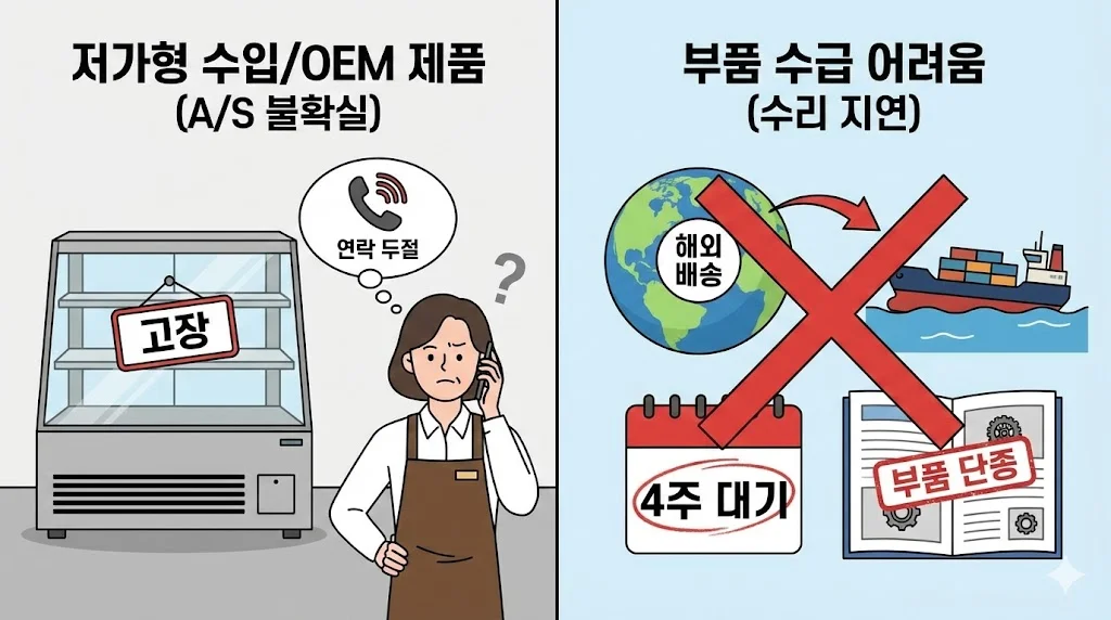 특히 여름철에 하루 이틀만 수리가 지연돼도 그 손해액은 쇼케이스 몇 대 값을 훌쩍 뛰어넘습니다. A/S가 늦어지는 것은 단순한 불편함이 아니라, 사장님의 통장에서 돈이 썰물처럼 빠져나가는 비상사태임을 명심해야 합니다.
