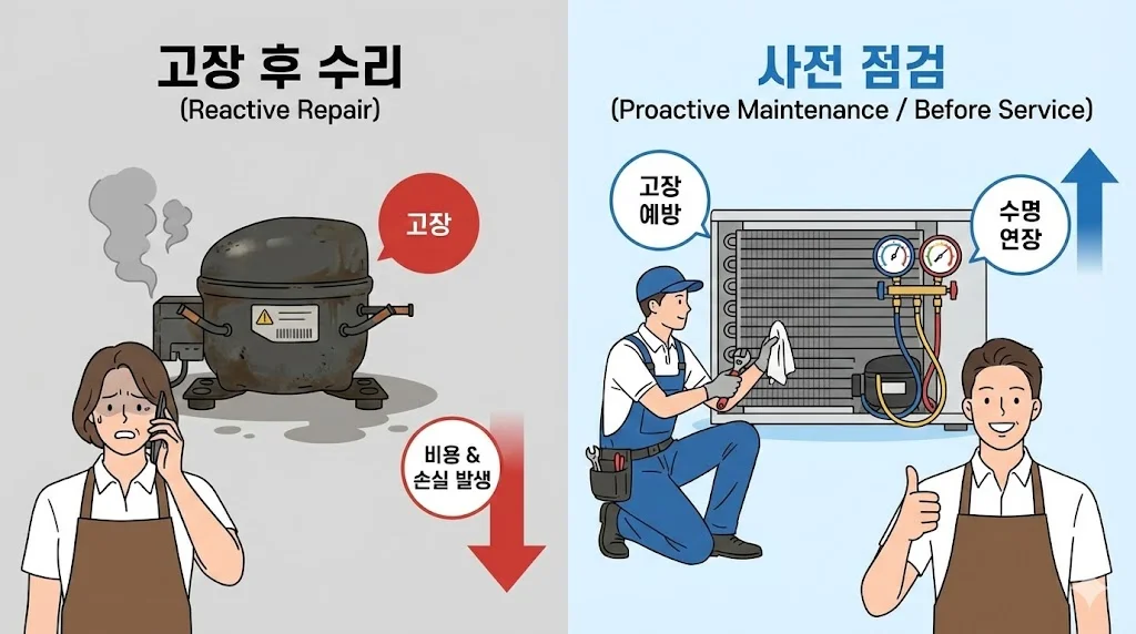 선진적인 쇼케이스 브랜드들은 단순히 고장 난 후에 수리해 주는 '사후 관리'를 넘어, 정기적으로 방문하여 장비 상태를 체크하고 소모품을 교체해 주는 '사전 유지보수(비포 서비스)' 프로그램을 운영합니다.