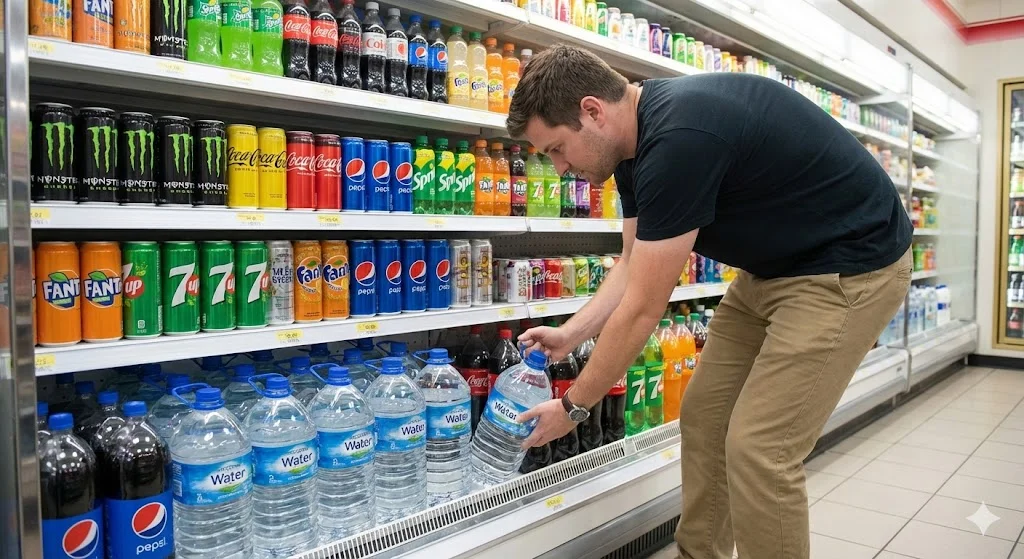 최하단: 2L 생수나 대용량 음료처럼 부피가 크고 무거운 상품 - 고객은 물이 필요하면 허리를 숙이는 불편을 기꺼이 감수합니다.