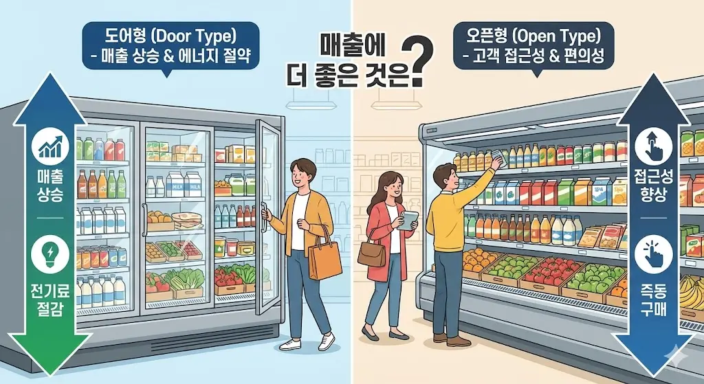 Q1. 마트쇼케이스, 문이 달린 '도어형'과 없는 '오픈형' 중 뭐가 매출에 좋을까요?