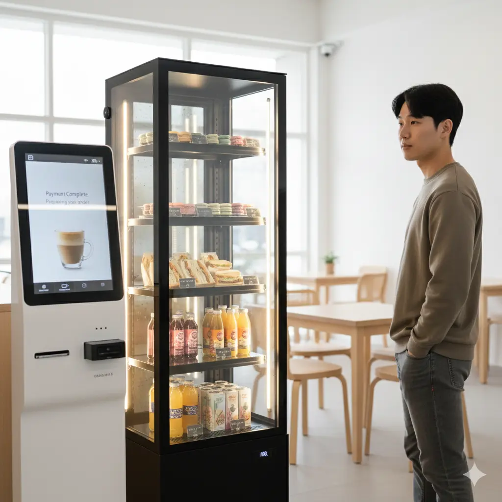 ๊ณ ๊ฐ์ด ํค์ค์คํฌ์์ ๊ฒฐ์ ๋ฅผ ๋ง์น๊ณ ์ปคํผ๊ฐ ์ถ์ถ๋๊ธฐ๋ฅผ ๊ธฐ๋ค๋ฆฌ๋ ์ฝ 40์ด์ ์๊ฐ, ๊ทธ ์์ ์ด ๋จธ๋ฌด๋ ์ ๋ฉด์ ์ผ์ผ์ด์ค๋ฅผ ๋ฐฐ์นํ์ธ์.