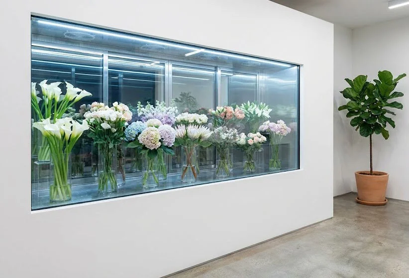 또한, 쇼케이스 내부 벽면을 거울로 마감하면 공간이 훨씬 넓어 보이고 꽃의 양이 많아 보이는 착시 효과를 주어 더욱 풍성한 매장 분위기를 연출할 수 있습니다.