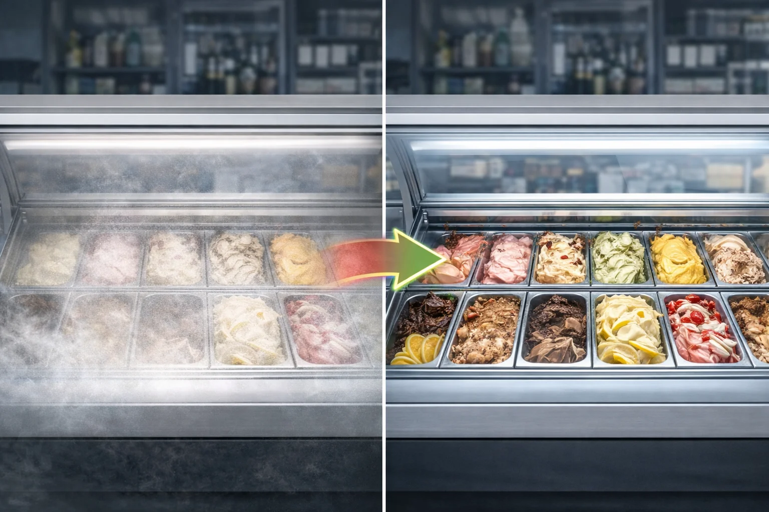 젤라또는 눈으로 먼저 먹는 디저트입니다. 중고 젤라또쇼케이스의 고질적인 문제 중 하나는 유리창의 결로 현상과 미세한 스크래치입니다.