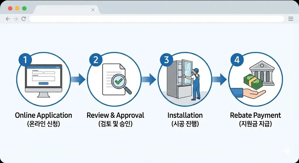 절차는 [사업 신청 -> 서류 검토 및 승인 -> 시공 진행 -> 완료 신고 및 현장 확인 -> 지원금 지급] 순으로 진행된답니다.