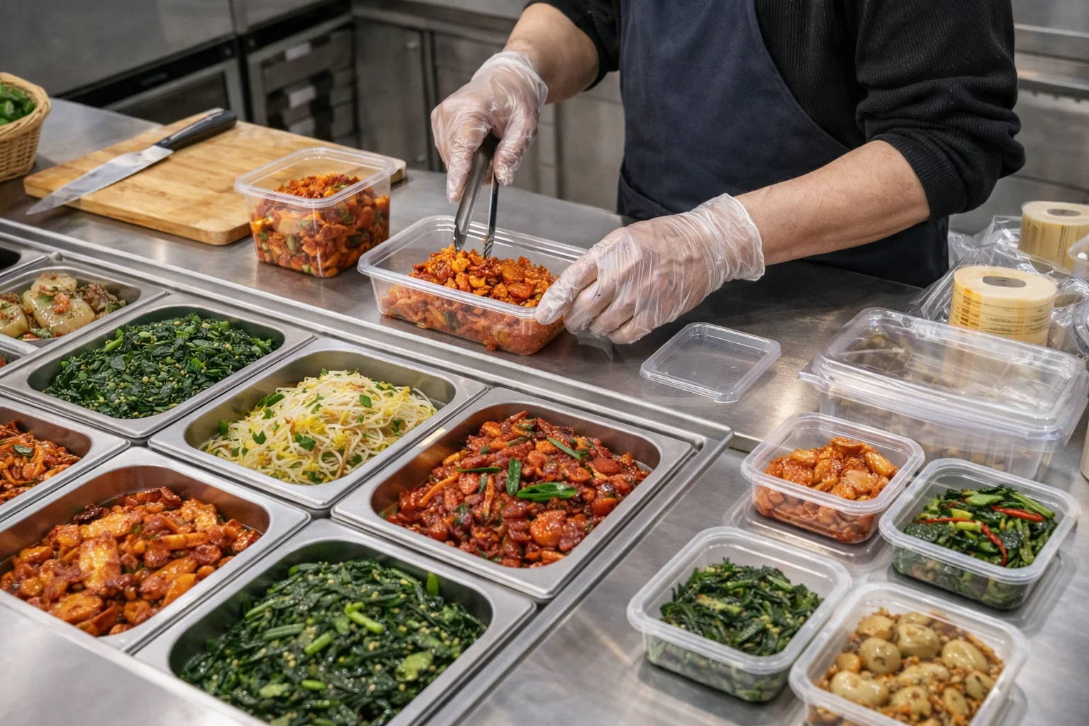 한쪽에서는 반찬을 담고, 한쪽에서는 포장을 하는 멀티태스킹이 가능해지므로 인건비와 동선 낭비를 줄여주는 효자 노릇을 톡톡히 합니다.