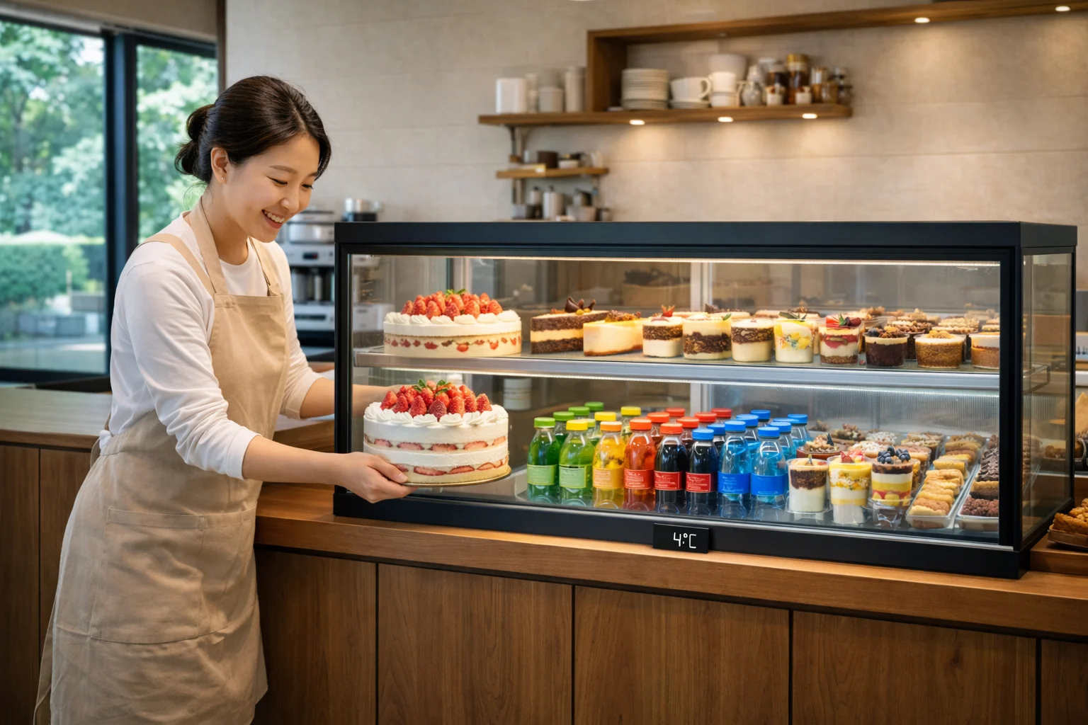 디저트에 이런 강한 바람이 직접 닿으면 수분이 순식간에 날아가 버려요. 퍽퍽해진 시트와 윤기 잃은 과일은 손님의 선택을 받기 어렵겠죠.