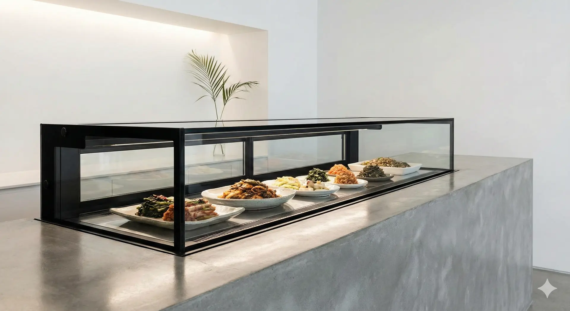 카운터형(소형): 공간이 협소한 매장에서 주로 사용하며, 계산대 옆에 배치하여 '오늘의 추천 반찬' 등을 전시해 추가 매출을 유도하기 좋습니다.