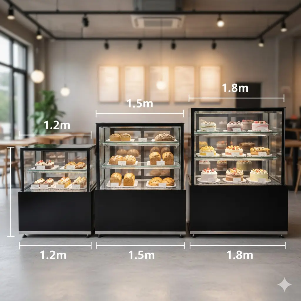 일반적으로 좌석 10석 기준 베이커리 카페라면 1.2~1.5m 쇼케이스가 적당해요. 하루 빵 생산량이 50~80개 정도면 1.5m, 100개 이상이면 1.8m 이상을 권장합니다.
