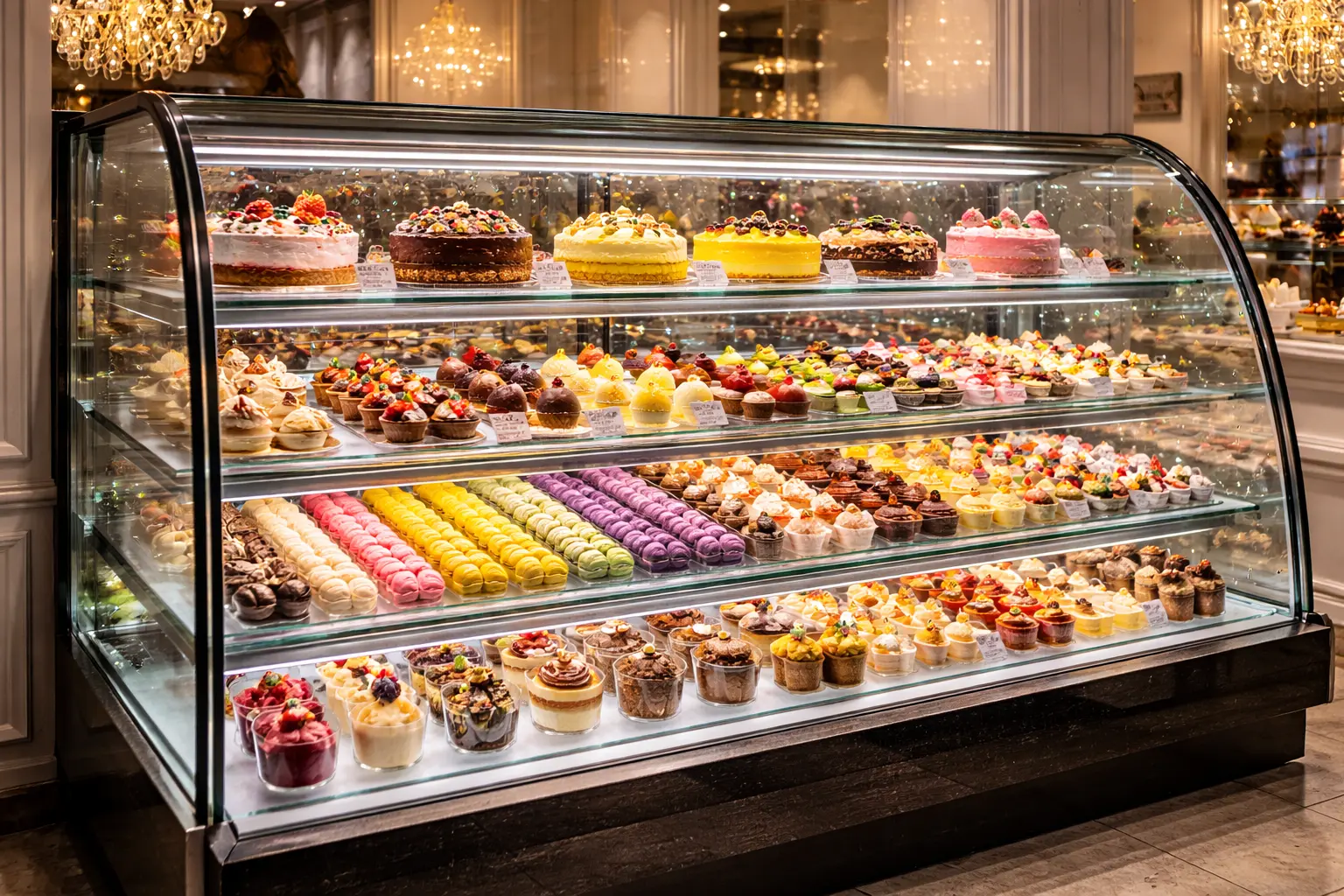 내부 온도를 5~10℃ 정도로 유지하는 일반적인 케이크 쇼케이스라면 표준 페어유리로도 충분한 효과를 볼 수 있습니다. 다만, 매장이 직사광선이 강하게 들어오는 통창 구조라면 Low-E 유리를 고려하는 것이 장기적으로 제품 변질을 막는 방법입니다.