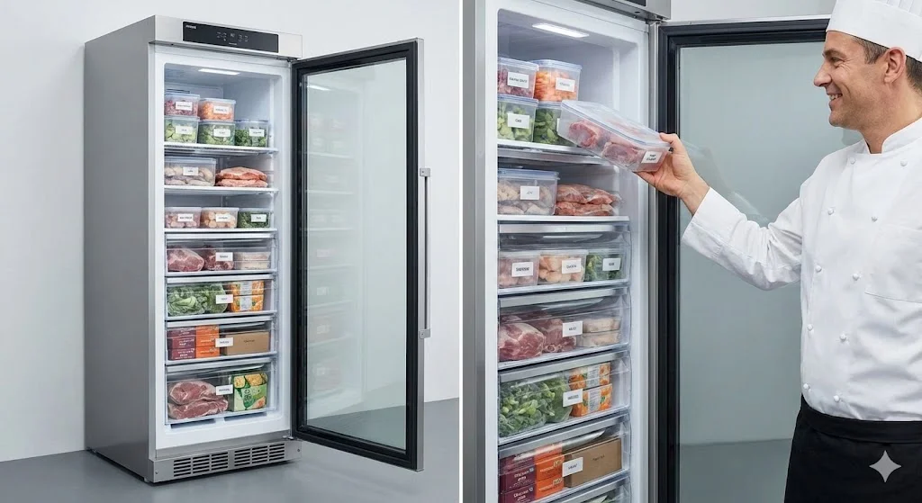 기존의 가로형 냉동고는 많은 양을 넣을 수 있지만, 아래쪽에 있는 식재료를 꺼내기가 매우 불편합니다. 이런 문제를 해결하고 주방의 수직 공간을 극대화하는 혁신적인 장비가 바로 전문적인 수직 냉동고입니다.