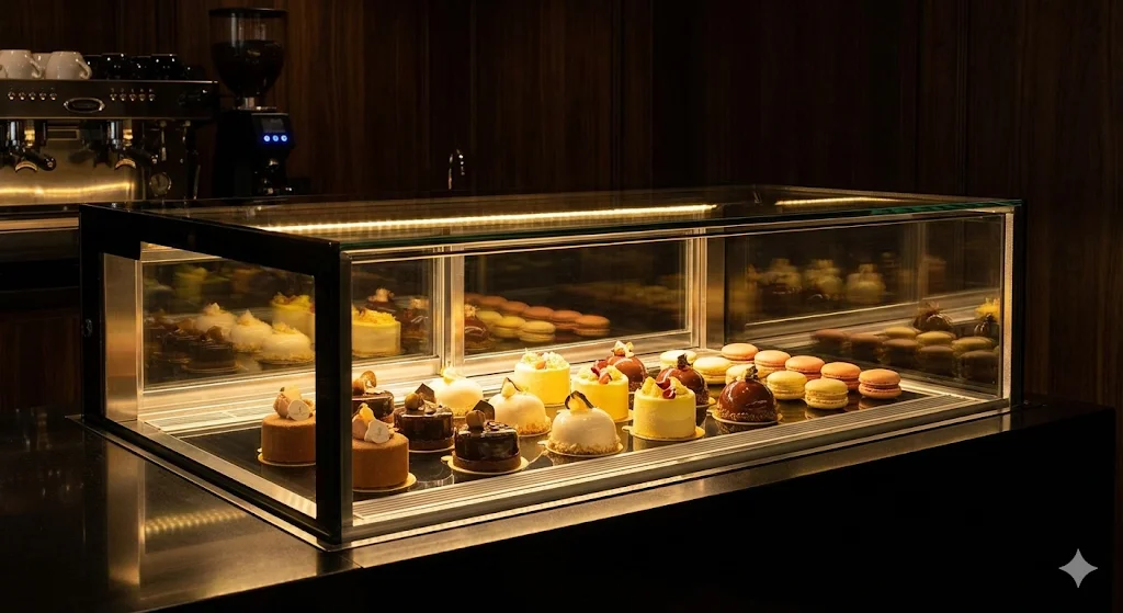 색재현력(CRI): 연색 지수가 높은 LED 조명을 사용한 냉장 쇼케이스는 식재료 본연의 색을 가장 생생하게 살려줍니다. 예를 들어 딸기 생크림 케이크의 딸기는 더 붉게, 생크림은 더 하얗게 보이게 하여 시각적인 만족도를 극대화합니다.