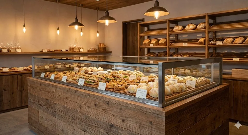 베이커리 | 평대 쇼케이스 | 상단 오픈 구조로 갓 구운 빵의 질감 강조 |