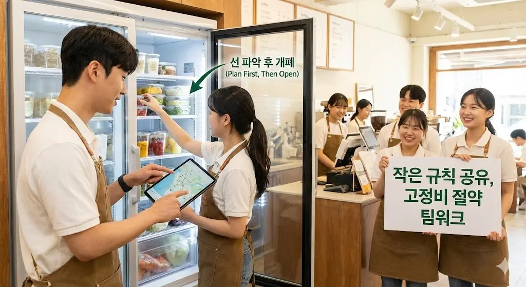 필요한 재료는 목록을 미리 생각한 뒤 한 번에 꺼내고, 쇼케이스의 경우 밖에서 위치를 파악한 뒤 문을 여는 '선 파악 후 개폐' 습관을 들이십시오. 직원들과 함께 이러한 작은 규칙을 공유하고 실천하는 것만으로도 매장의 고정비를 줄이는 강력한 에너지 절약 팀워크를 완성할 수 있습니다.