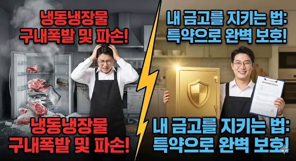 사장님들이 흔히 가입하시는 '화재보험'이나 '영업배상책임보험'만으로는 냉장고 고장으로 인한 식재료 폐기 손해를 온전히 보상받기 어렵습니다. 반드시 보험 가입 시 '냉동냉장물 구내폭발 및 파손 특약' 혹은 '음식물 손실 보상 특약'이 포함되어 있는지 확인해야 합니다.