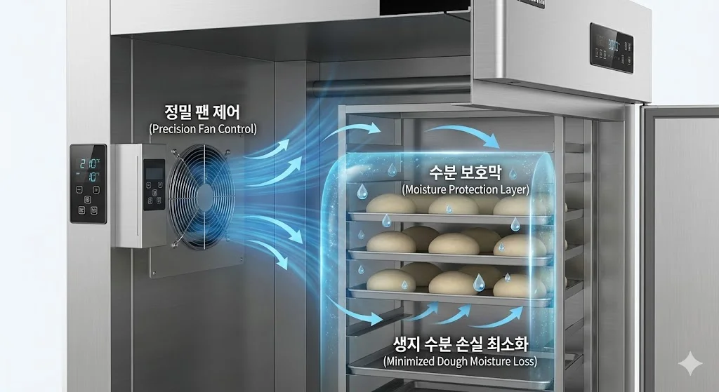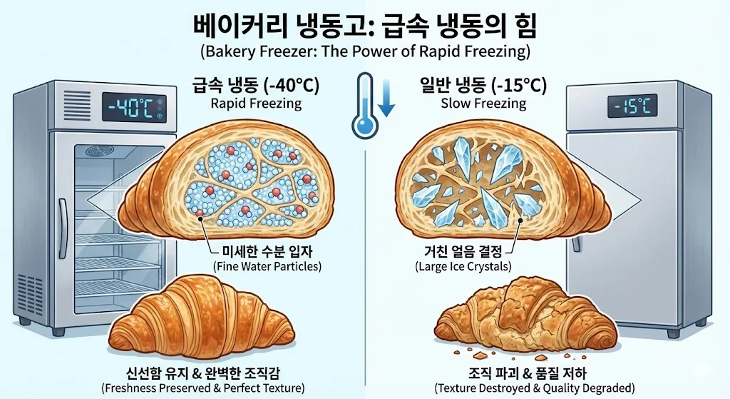 ๋ํ, ๋ณด๊ด ๊ณผ์ ์์๋ ์ํ 18๋ ์ดํ๋ฅผ ์ผ์ ํ๊ฒ ์ ์งํ๋ฉฐ ์จ๋ ํธ์ฐจ๋ฅผ ์ต์ํํ๋ ์ ๋ฐ ์ ์ด ๋ฅ๋ ฅ์ด ์ฌ์ฅ๋์ ๊ธฐ์ ๋ ฅ์ ๋ท๋ฐ์นจํฉ๋๋ค. ์จ๋๊ฐ ์๋์น๋ฉด ์์ง ํ๋ฉด์ ์ฑ์๊ฐ ์๊ธฐ๊ณ ์ด๋ ๊ณง '๋๋ ํ์(Freezer Burn)'์ผ๋ก ์ด์ด์ ธ ๋นต์์ ์ก๋ด๊ฐ ๋๋ ์์ธ์ด ๋ฉ๋๋ค.