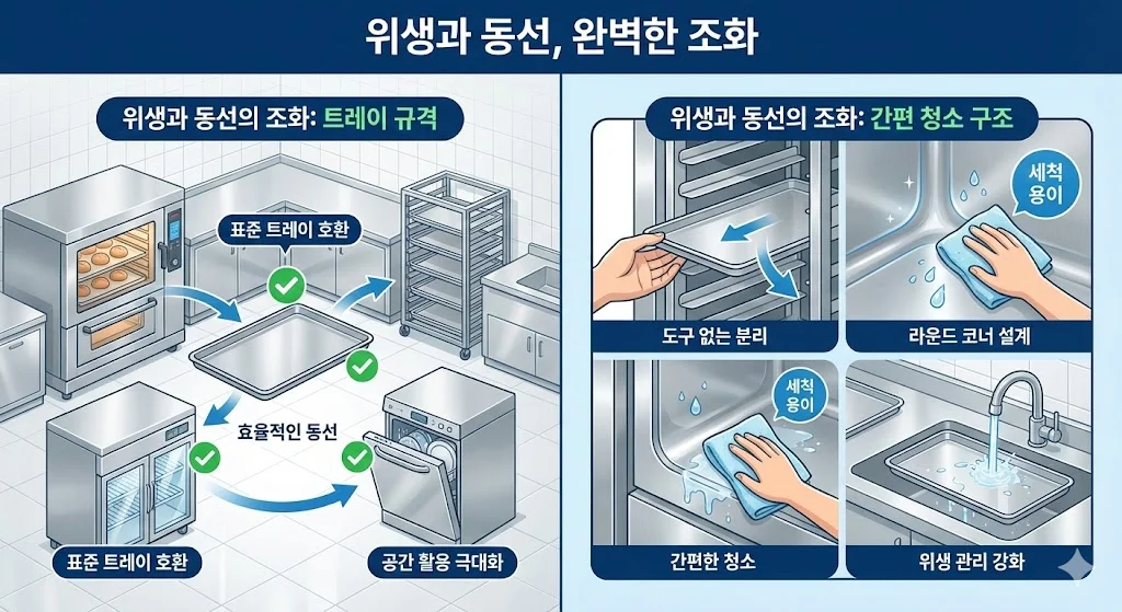 ๋ํ, ๋นต์ง์์ ๊ณต์ฉ์ผ๋ก ์ฌ์ฉํ๋ '๋ ํธ๋ ์ด(Rack Tray)'๊ฐ ๋๋๊ณ ๋ด๋ถ์ ๊ท๊ฒฉ๋๋ก ์ ๋ค์ด๊ฐ๋์ง ํ์ธํ๋ ๊ฒ์ ๋์ ํจ์จ์ ํต์ฌ์ ๋๋ค. ํธ๋ ์ด ์ฑ๋ก ๋ฐ๋ก ๋ฃ๊ณ ๋บ ์ ์์ด์ผ ์์ ์๊ฐ์ ๋จ์ถํ๊ณ ๋๊ธฐ ์ ์ถ์ ์ต์ํํ์ฌ ์๋์ง ํจ์จ์ ๋์ผ ์ ์๊ธฐ ๋๋ฌธ์ ๋๋ค.