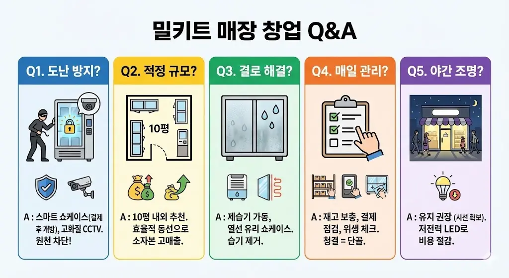 Q4. ๋งค์ผ ๋งค์ฅ์ ๋๊ฐ์ ๊ด๋ฆฌํด์ผ ํ ๋ถ๋ถ์ ๋ฌด์์ธ๊ฐ์? A: ์ฌ๊ณ ๋ณด์ถฉ๊ณผ ๊ฒฐ์ ์ฅ๋น ์ ๊ฒ, ๊ทธ๋ฆฌ๊ณ ์ผ์ผ์ด์ค ๋ด๋ถ ์์ ์ํ๋ฅผ ๋งค์ผ ์ฒดํฌํด์ผ ํฉ๋๋ค. ์ฒญ๊ฒฐํ ๋งค์ฅ ์ด๋ฏธ์ง๊ฐ ๊ณง ๋จ๊ณจ ํ๋ณด์ ํต์ฌ์ ๋๋ค.
