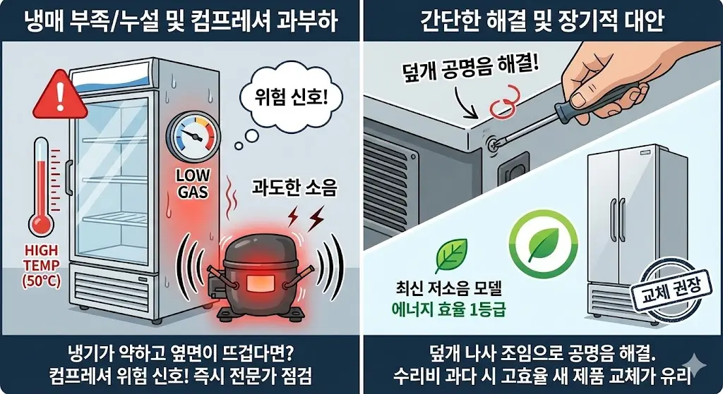 ๋ง์ฝ ์์๊ณผ ํจ๊ป ๋์ฅ๊ณ ์๋ฉด์ด ์ง๋์น๊ฒ ๋จ๊ฒ๊ฑฐ๋ ๋๊ธฐ๊ฐ ์์ ๊ฐ์ง ์๋ค๋ฉด, ์ด๋ ์ปดํ๋ ์ ๊ฐ ๋ง์ง๋ง ํ์ ๋คํด ๋ฒํฐ๊ณ ์๋ค๋ ์ํ ์ ํธ์ ๋๋ค. ์ด๋๋ ์ง์ฒดํ์ง ๋ง๊ณ ์ ๋ฌธ๊ฐ๋ฅผ ๋ถ๋ฌ ์ ๊ฒ๋ฐ์ผ์ ์ผ ํ๋ฉฐ, ์๋ฆฌ๋น๊ฐ ๊ณผ๋ํ๋ค๋ฉด ์๋์ง ํจ์จ์ด ์ข์ ์ต์ ์ ์์ ๋ชจ๋ธ๋ก ๊ต์ฒดํ๋ ๊ฒ์ด ์ฅ๊ธฐ์ ์ผ๋ก ์ ๋ฆฌํฉ๋๋ค.