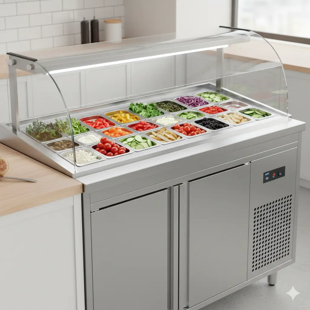 도어형 쇼케이스: 주문형(Custom) 샐러드 전문점에 적합합니다. 냉기 보존이