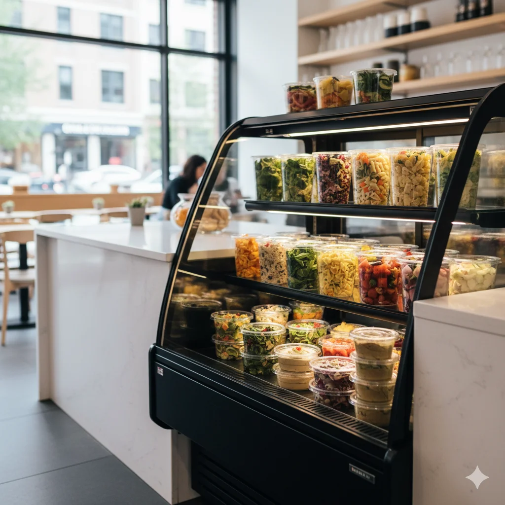 샐러드 쇼케이스는 매장 입구 쪽이나 카운터 바로 옆에 배치되는 경우가 많습니다. 이