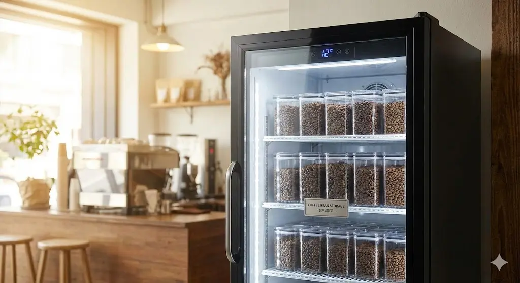 원두를 보관하는 공간은 매장의 위생 수준을 보여주는 가장 정직한 지표이며, 이는 곧 커피의 순수한 맛으로 직결됩니다. 원두냉장보관을 위한 장비는 내부 소재가 위생적인 스테인리스나 강화유리로 마감되어 냄새 배임이 없고 청소가 간편해야 합니다.