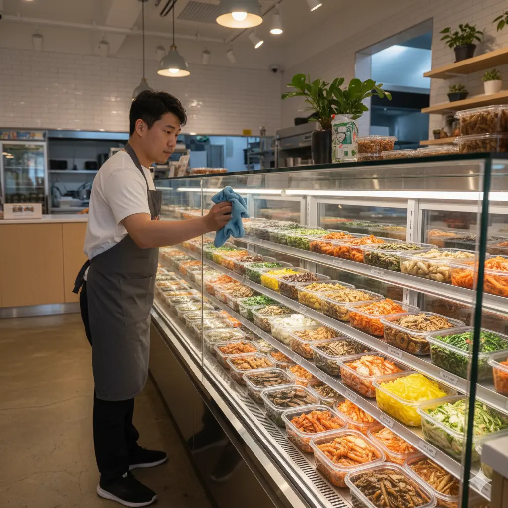 매일 마감 시 유리에 묻은 손자국이나 이물질을 닦아주는 사소한 습관이 모여 반찬쇼케이스의 수명을 연장하고 매장의 신뢰도를 높입니다.