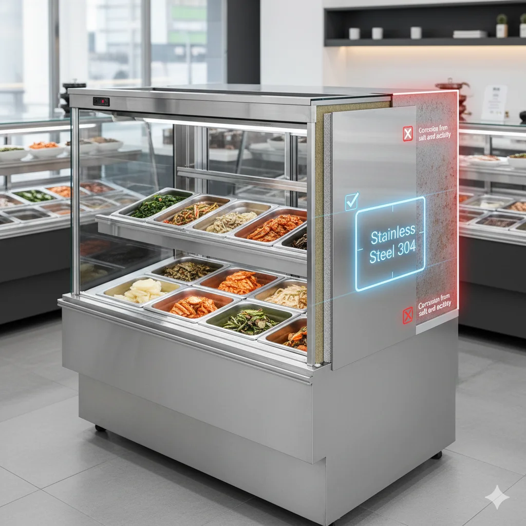 Q2. 염분과 산도에 의한 내부 부식, '스테인리스 304'와 단열재 밀도의 중요성 반찬가게쇼케이스