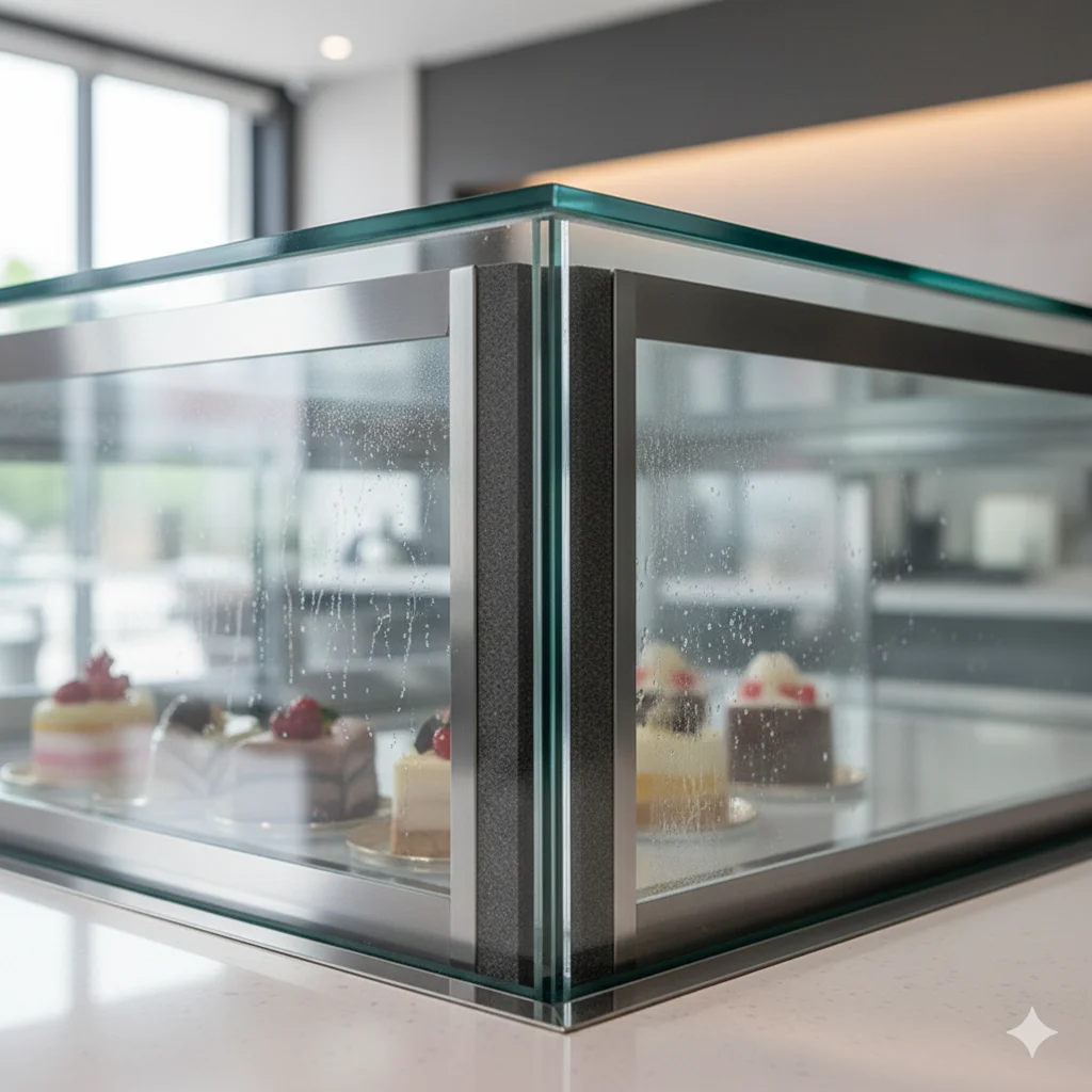 장마철이나 겨울철 가습기 가동 시 쇼케이스 유리에 맺히는 이슬은 제품을 가릴 뿐만 아니라, 흘러내린 물이 위생 문제를 야기하는 위기 요소입니다.