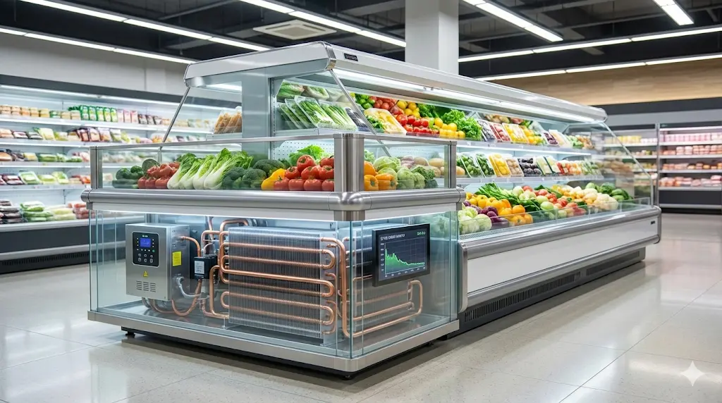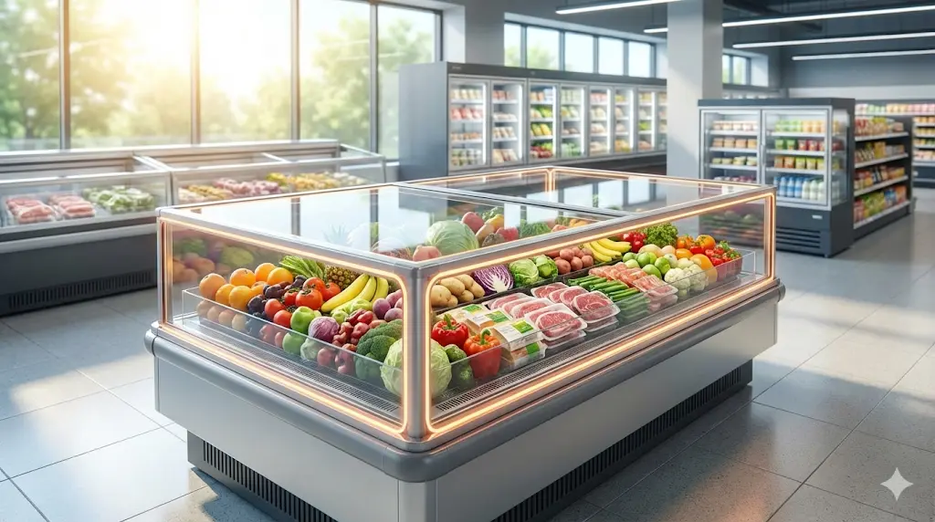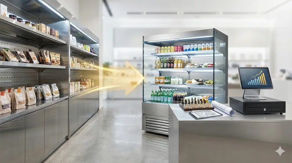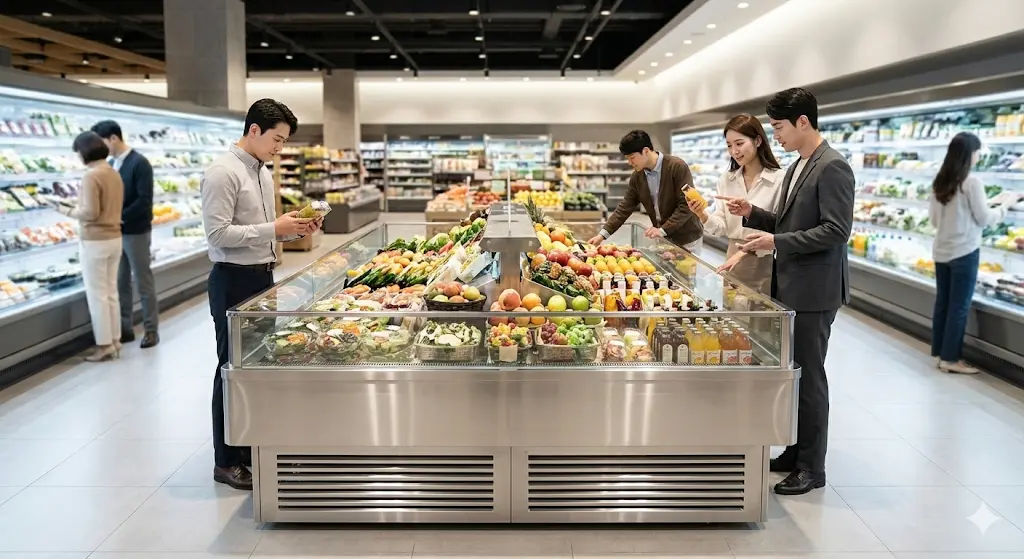 효율적인 동선 설계를 위한 아일랜드 배치, 변질을 막는 정밀 인버터 제어, 그리고 시인성을 극대화하는 결로 방지 기술이 핵심입니다.