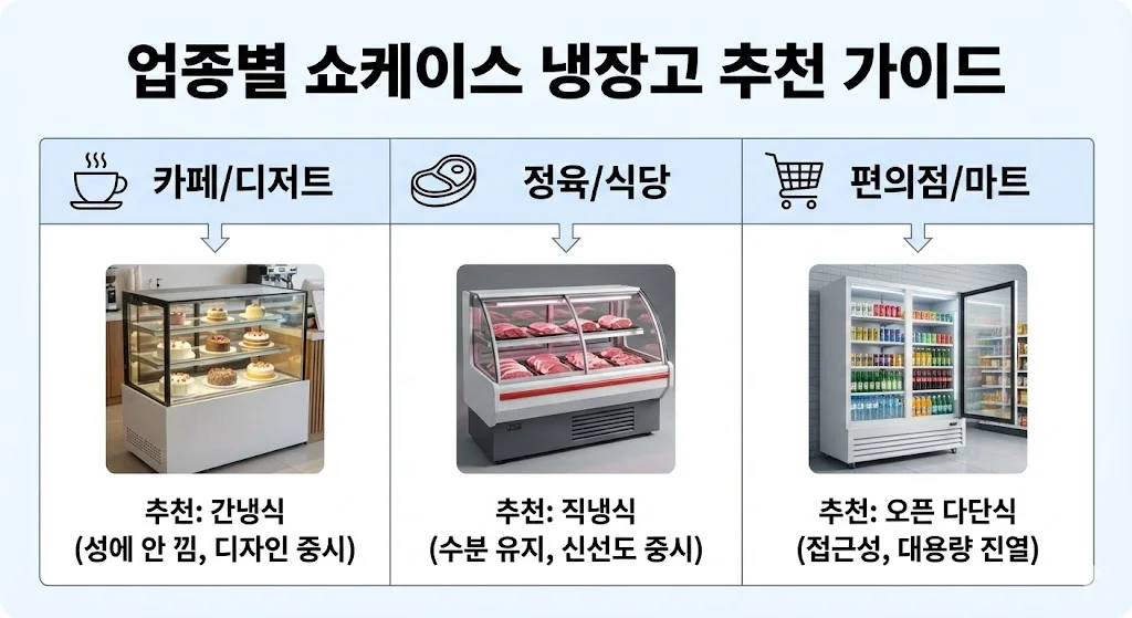 편의점 | 음료 쇼케이스, 도시락 박스 | 아이스크림 (강력한 냉동력 필요) |