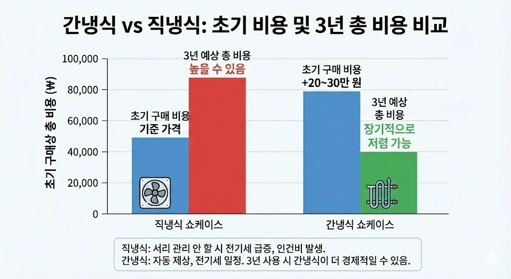 실제로 카페 운영하시는 사장님이 케이크 쇼케이스를 간냉식으로 설치했다가 3일 만에 폐기량이 30% 늘어서 직냉식으로 재구매하신 사례도 있습니다.