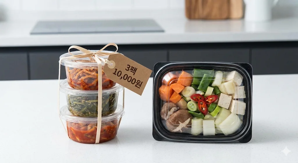 밀키트형 반찬 세트: 단순히 완성된 반찬뿐만 아니라, 집에서 마지막에 끓이기만 하면 되는 반조리 형태의 메뉴를 구성해 보세요. 신선함과 조리의 즐거움을 동시에 제공하며 단가를 높일 수 있습니다.