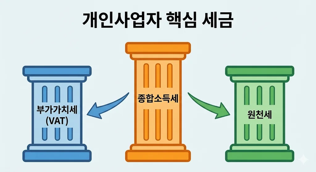 사업을 시작하면 '버는 만큼 세금을 낸다'는 기본 원칙 아래 다양한 세목을 마주하게 됩니다. 개인사업자 세금은 크게 세 가지 기둥으로 이루어져 있다고 이해하시면 쉽습니다.