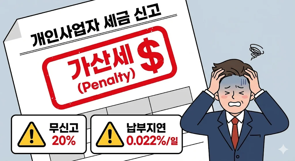 세금 신고 일정을 강조하는 이유는 바로 무시무시한 '가산세' 때문입니다. 개인사업자 세금 신고 기한을 단 하루라도 넘기면, 원래 내야 할 세금 외에 추가적인 페널티가 붙습니다.