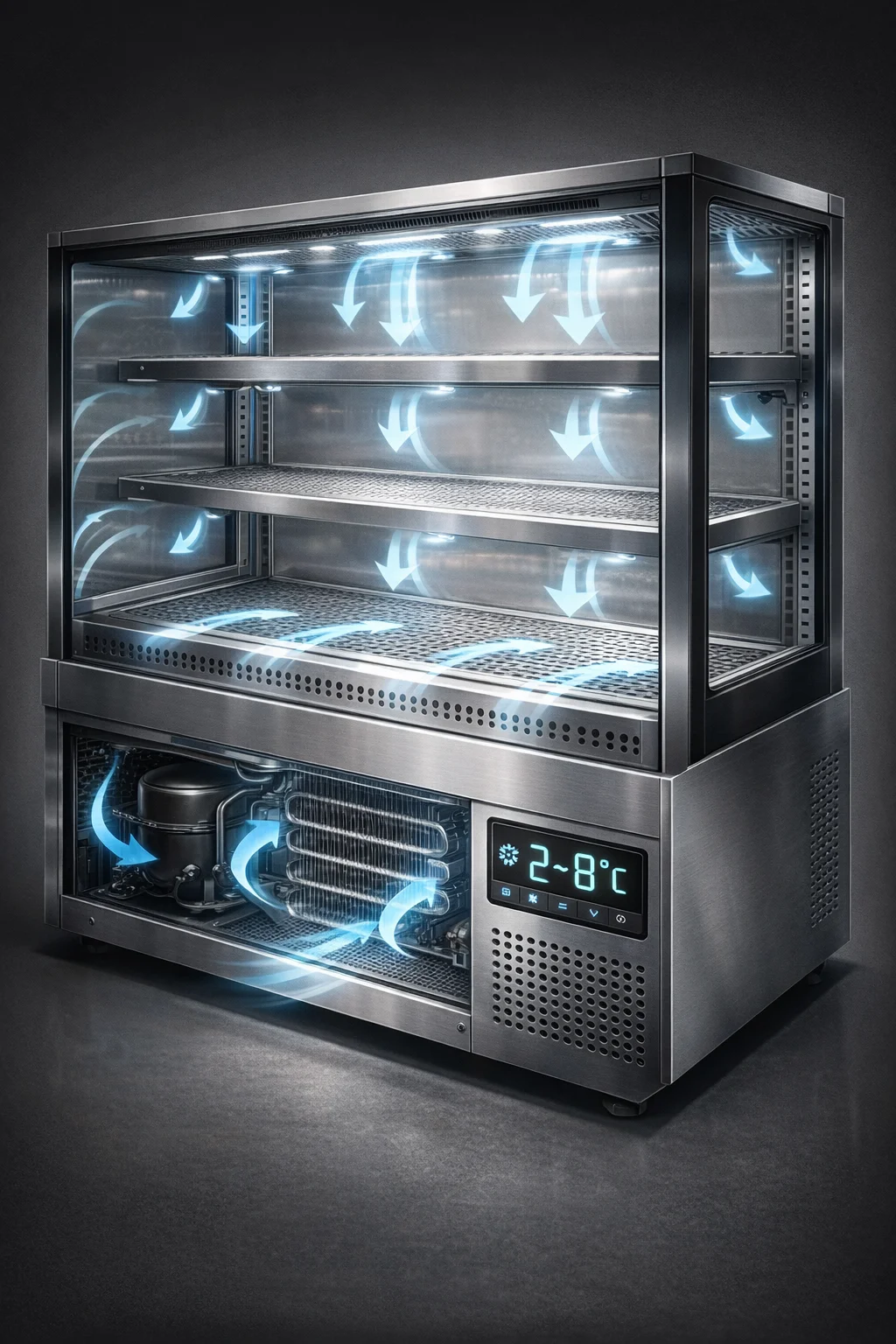 특히 중요한 건 내부 온도인데요. 2~8도 사이를 일정하게 유지하는 강제 순환 방식을 사용하고 있어요. 직접 냉각 방식은 김이 서리기 쉽지만, 스타벅스쇼케이스처럼 팬이 돌아가는 강제 순환 방식은 유리창이 깨끗하게 유지되어 전시 효과가 뛰어나거든요.