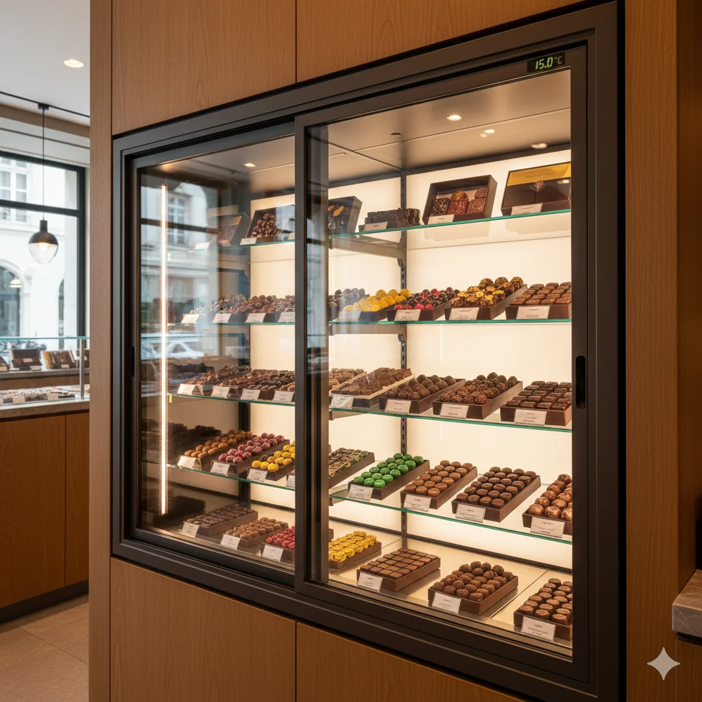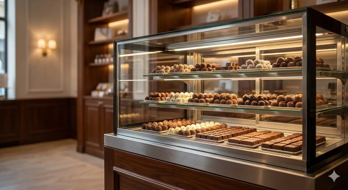 초콜릿 쇼케이스에서 조명은 양날의 검입니다. 초콜릿을 돋보이게 해야 하지만, 조명에