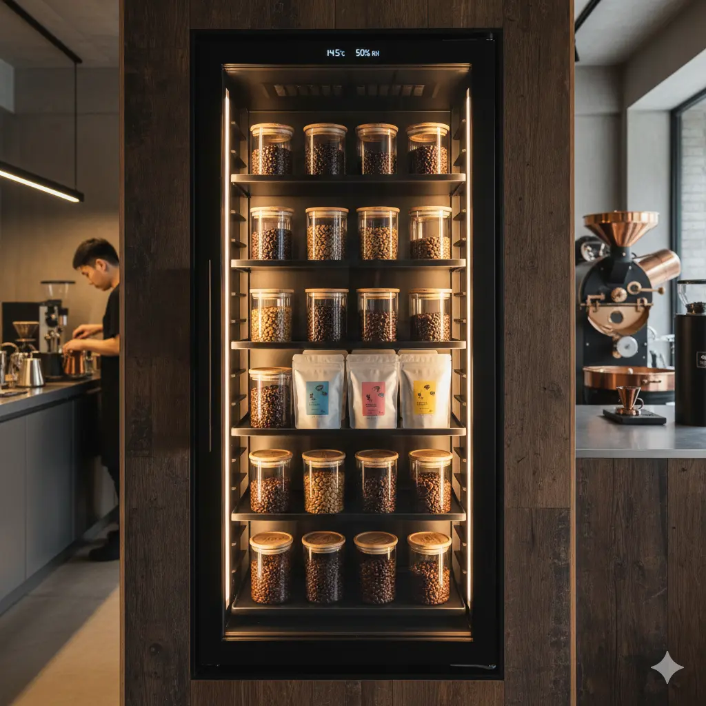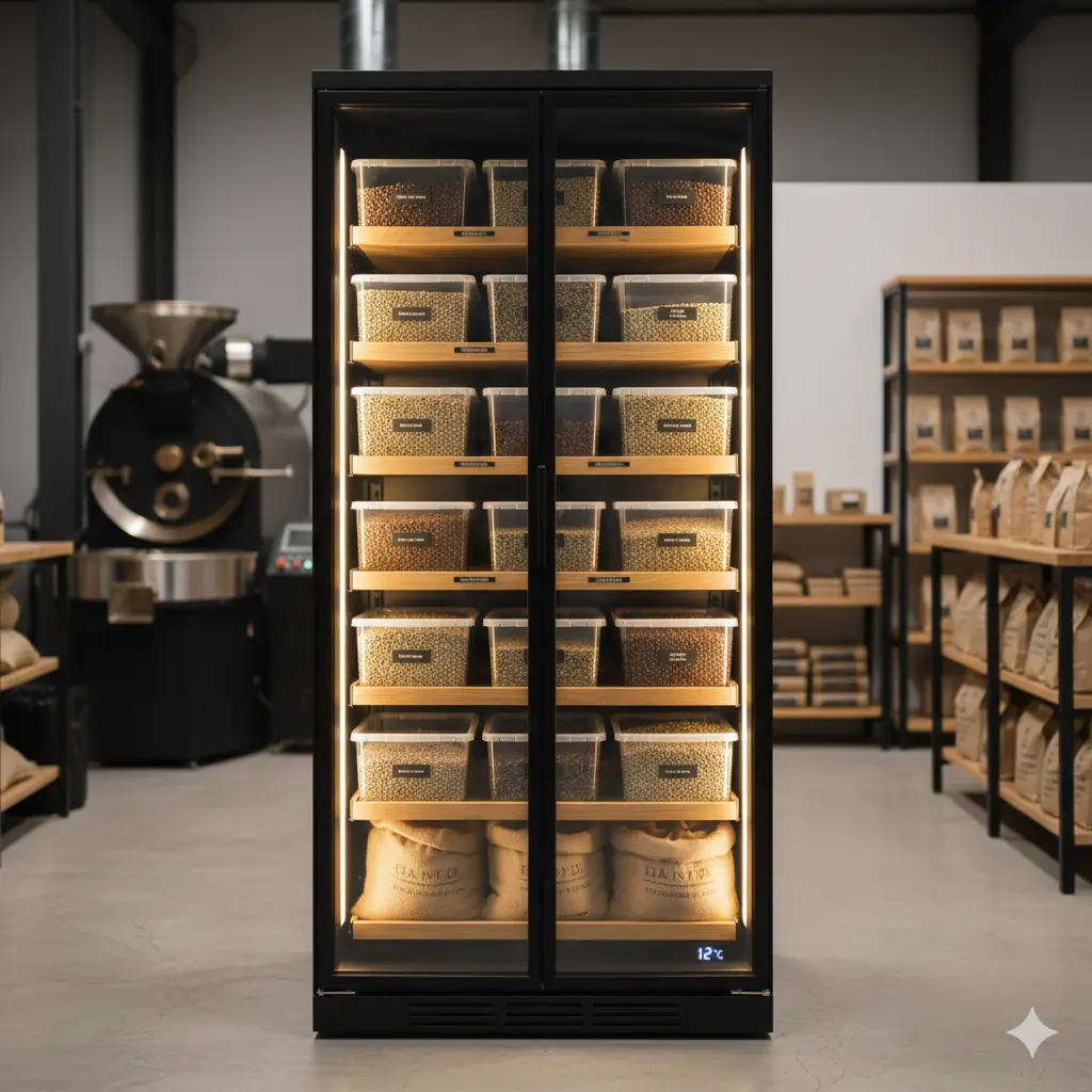 가정용 냉장고나 일반 쇼케이스에 원두를 넣었을 때 가장 큰 문제는 '냄새 혼입'과 '습도