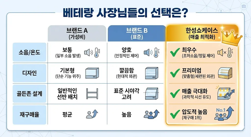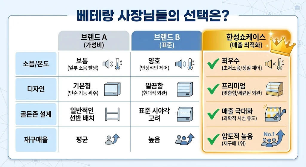 구분 | 브랜드 A (가성비형) | 브랜드 B (표준형) | 한성쇼케이스 (매출 최적화형) |
