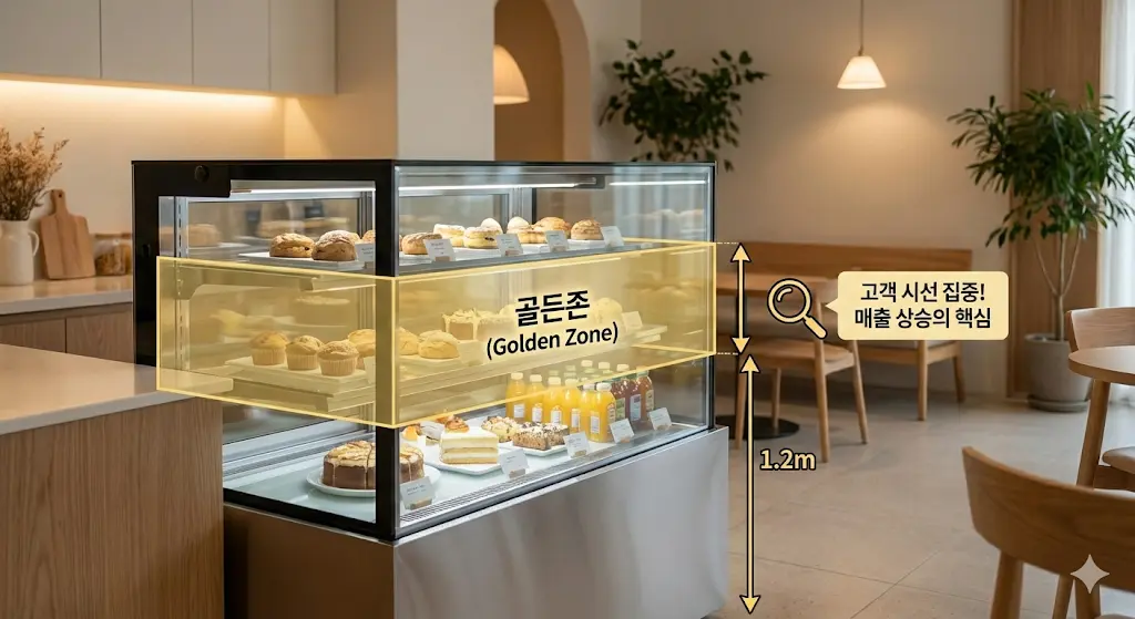 우리는 흔히 예쁘게 담기만 하면 된다고 생각하죠. 하지만 고객의 뇌는 본능적으로 가장 편안한 높이의 물건에 먼저 반응합니다.