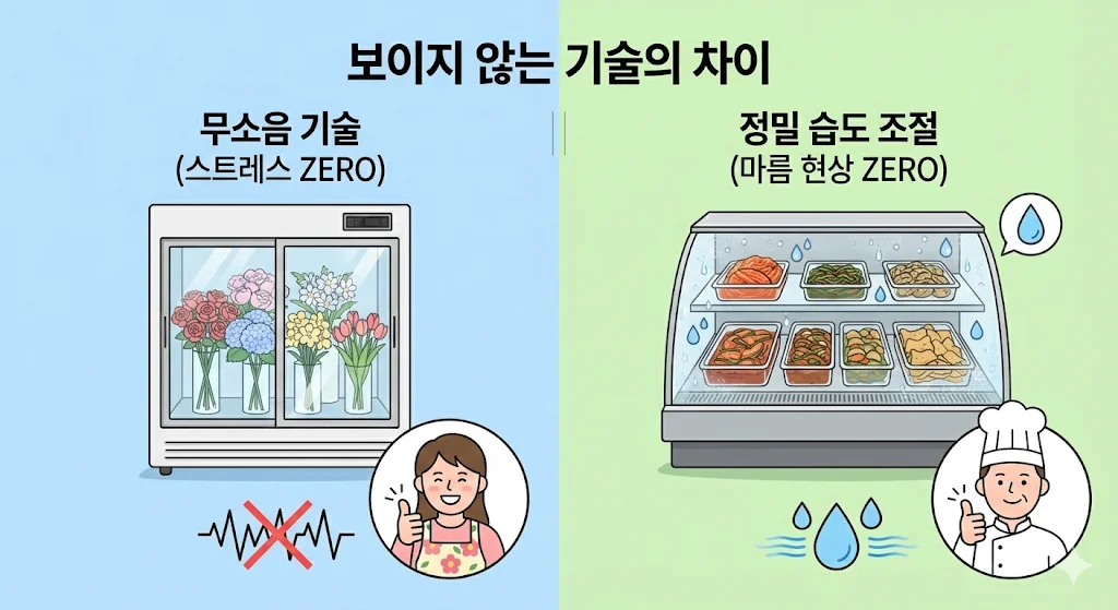 한성 무소음 꽃냉장고: 소음에 민감한 플라워 샵 사장님들을 위해 진동과 소음을 혁신적으로 줄였습니다. 꽃의 스트레스는 낮추고 손님과의 대화는 더 선명해집니다.