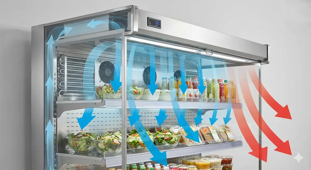 한성쇼케이스 (매출 최적화형): 압도적인 에어커튼 기술로 오픈형의 한계를 극복했습니다. 특히 한성쇼케이스는 상품 본연의 색감을 살리는 고연색성 LED를 적용해, 샐러드나 샌드위치를 마치 방금 만든 것처럼 보이게 하는 마법을 부립니다.