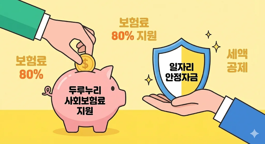 두루누리 사회보험료 지원: 근로자 10인 미만 사업장 중 저임금(월 270만 원 미만) 근로자를 고용할 경우, 고용보험과 국민연금 보험료의 80%를 국가에서 지원해 줍니다.